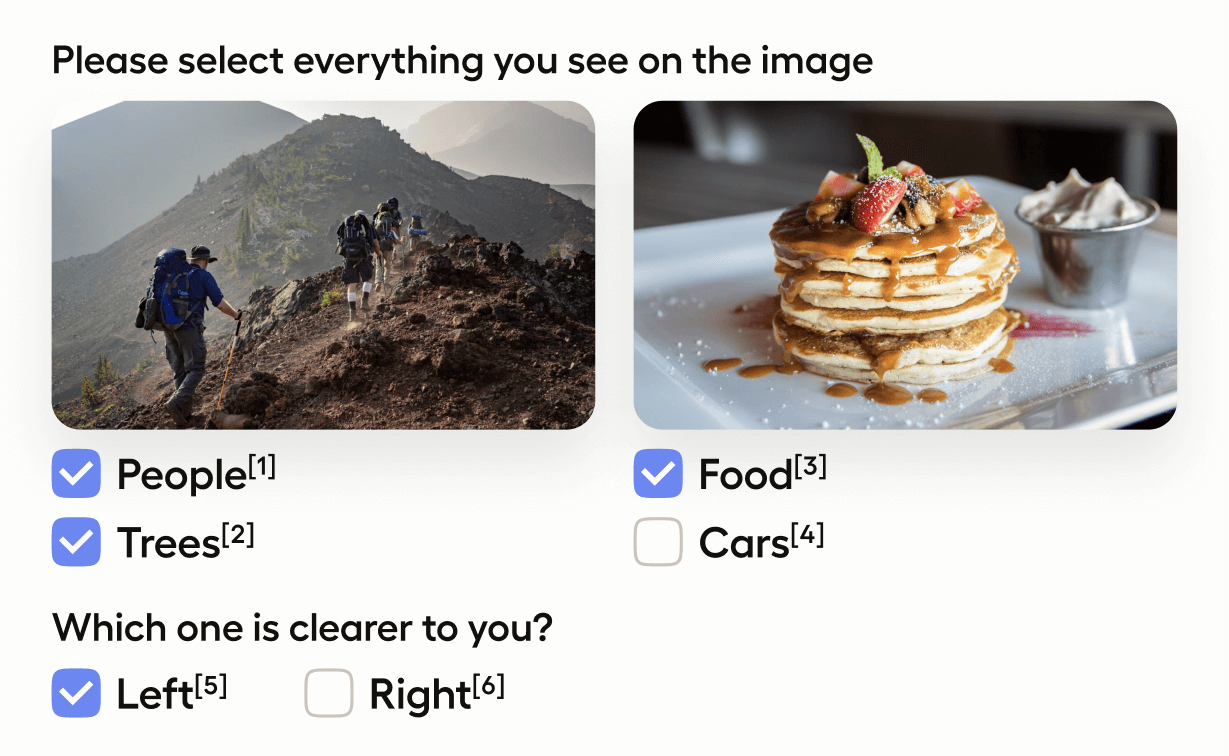 Close both View tags for the image and choice styling, and use a new View tag to separate the remaining overall classification options. You can add a header to provide instructions to the annotator, and use the Choices control tag to display choices about both images.